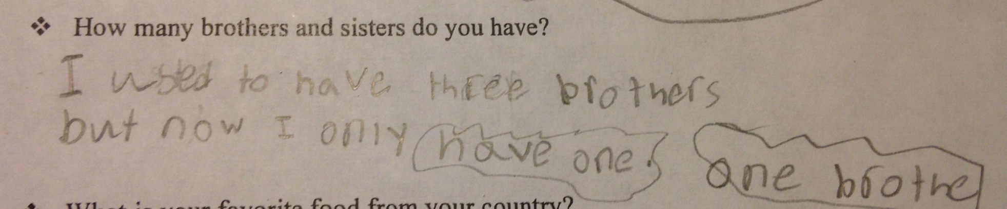 At first she did not immediately answer the question “How many brothers and sisters do you have?” Instead, she looked at me thoughtfully and asked, “Mama, how many brothers do I have?” Before I could say anything she said “I know!!” and she began to write . . .
