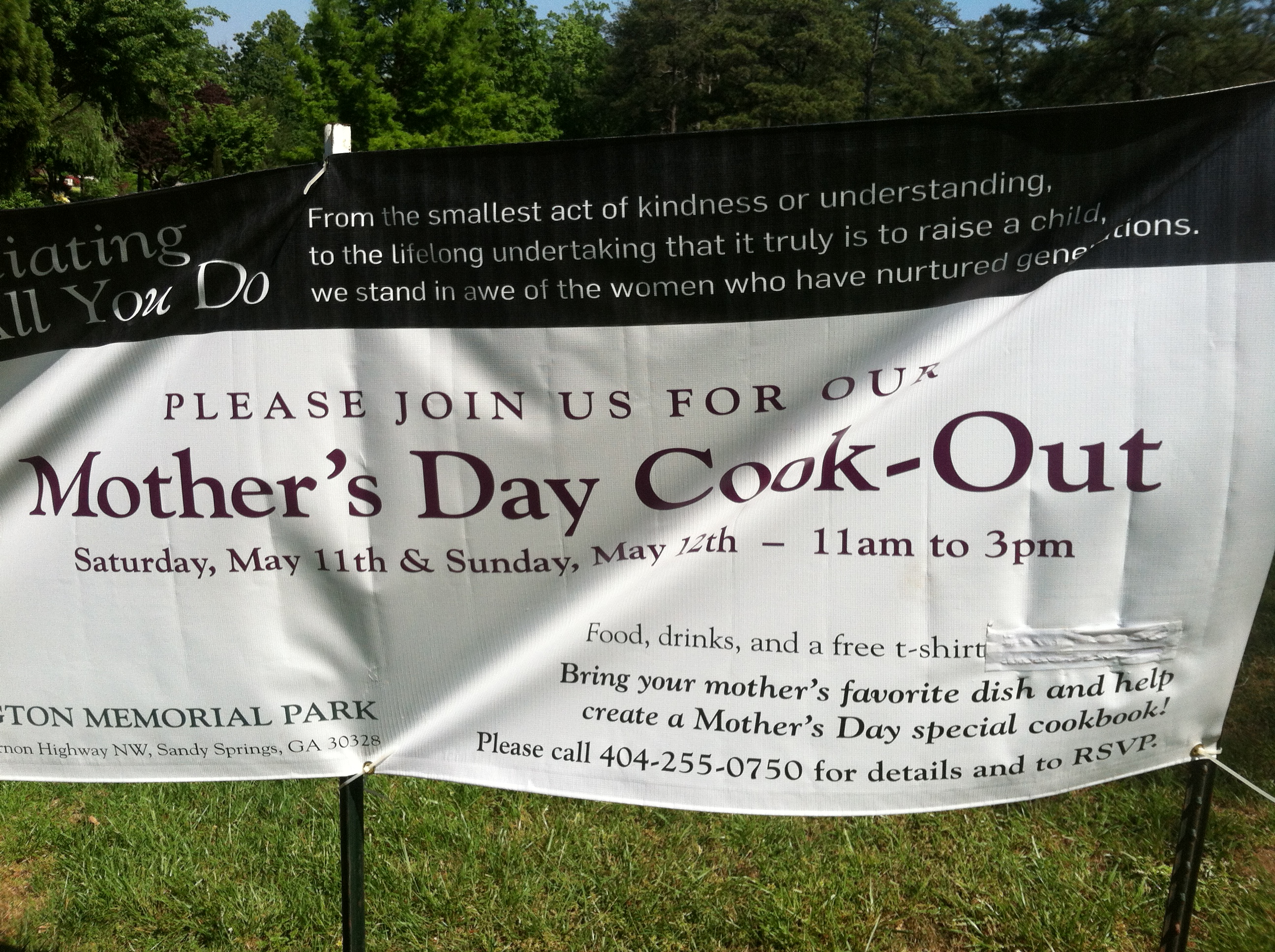 Maybe the cemetery has a new marketing person. Or, maybe I have missed the sign in past years. Either way, it just seems odd to have a Mother’s Day cook out at the cemetery. And, what would one do with a t-shirt from the cemetery?